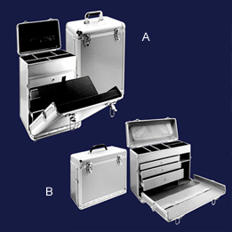 Maletín para maquillaje con ruedas, confortable muy movible. Este maletín de aluminio es muy estable, proporciona mucho lugar y una buena distribución para los materiales de trabajo. El maletín se abre de arriba y de frente. 3 cajones permiten transportar el maletín segura y ordenadamente. En la base ofrece lugar suficiente para guardar sprays, kleenex-box u otros utensilios. |